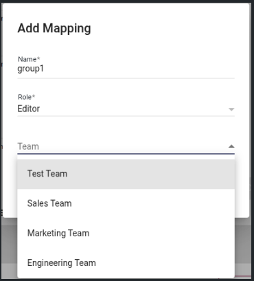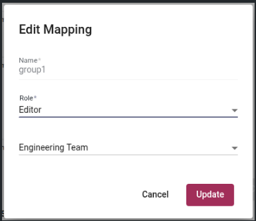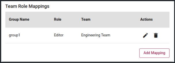 The Edit Team Role Mapping action lets users update the role and team in an existing mapping. The group name cannot be changed after creation. To edit a mapping: