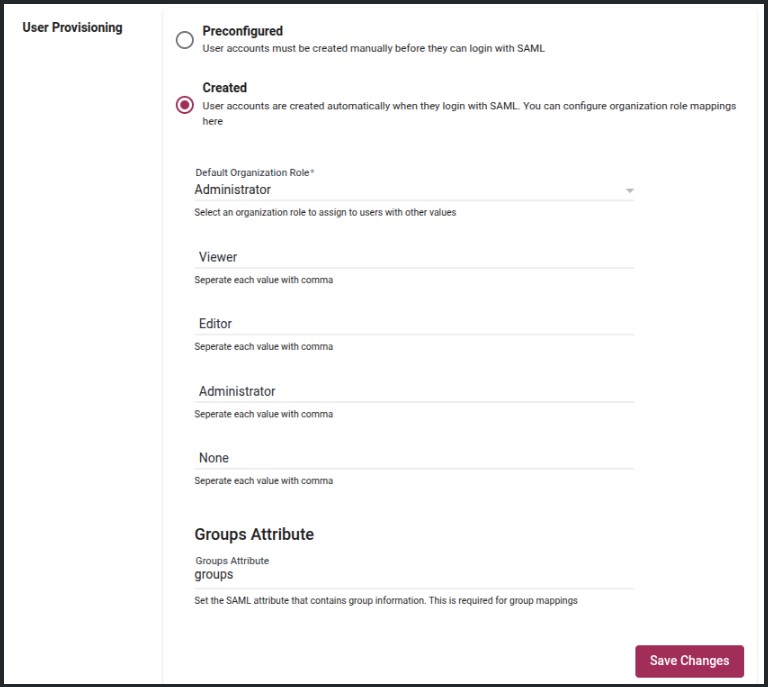 Groups Attribute, enter the IdP group attribute name configured in your SAML application.- Example: if your IdP sends groups in