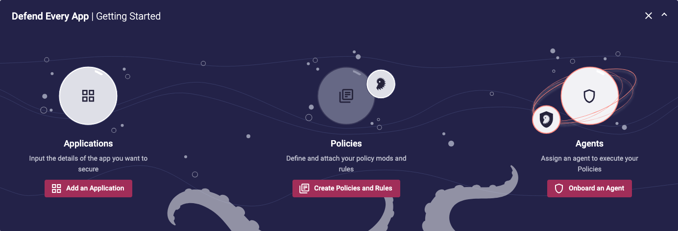 These donut charts provide a visual status and total number count of the Applications, Policies, and Agents that exist within the Portal at any given time. Each card has a base panel that links out to the relevant pages for more detailed list views of the Applications, Policies, and Agents.