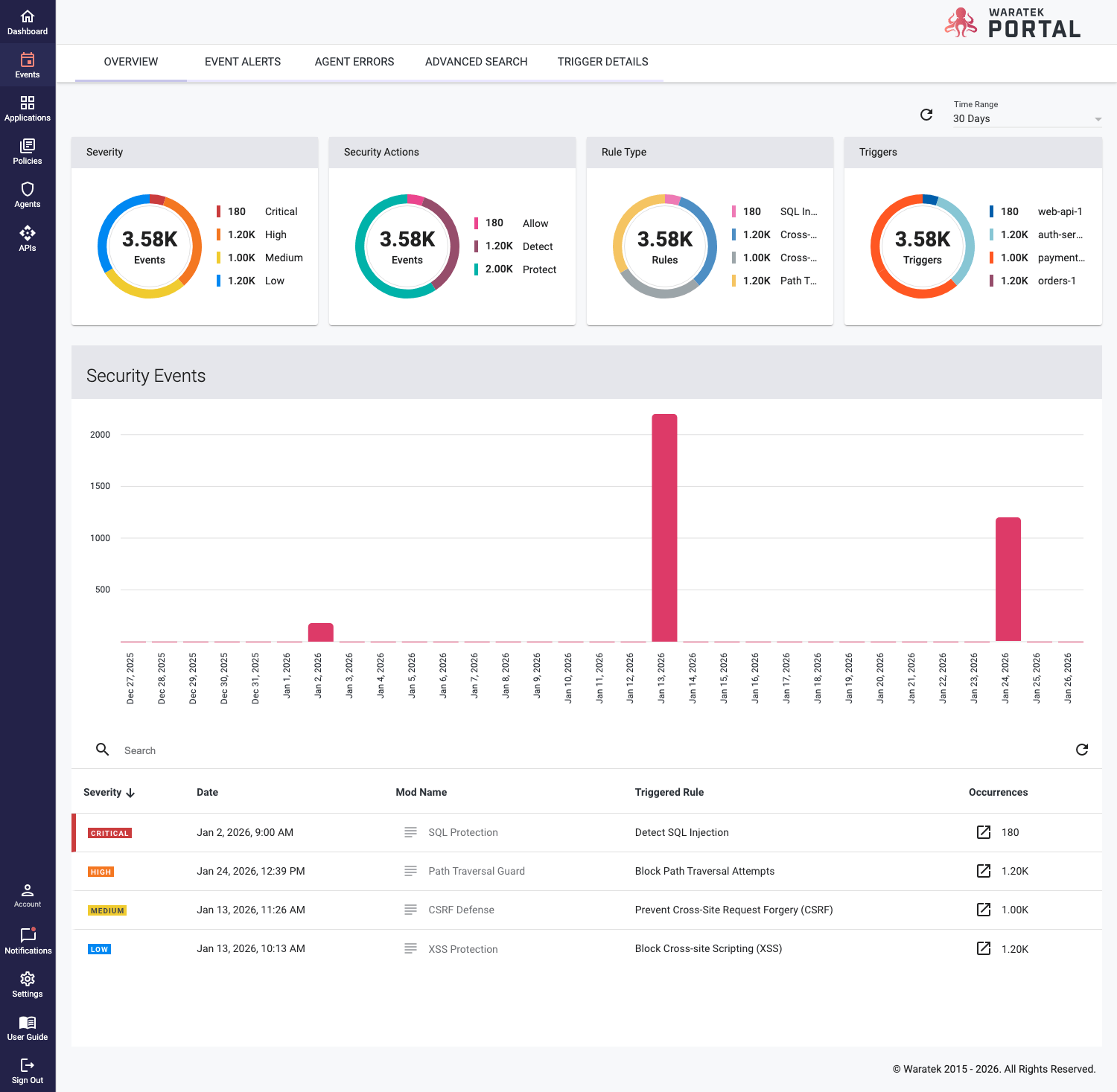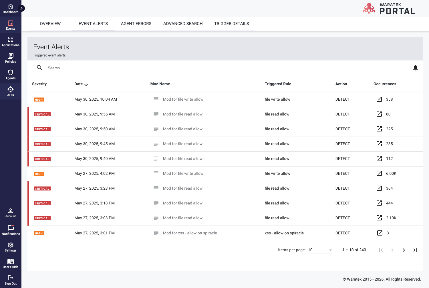 Agents report security events to the Portal's Event page. These events provide security information and are triggered by rules. Rules can be created or adapted to track your specific security activity.