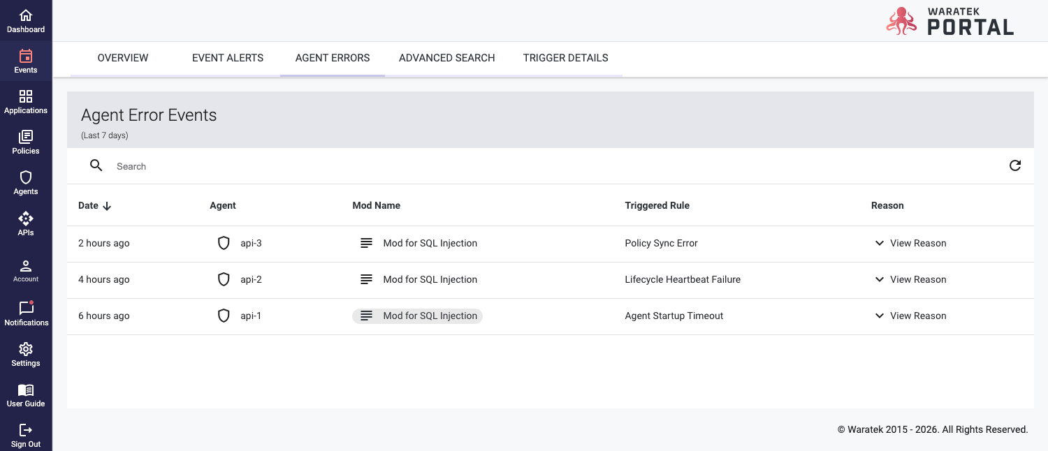 beside the agent name will open the agent details page where, under the Events tab, the full list of lifecycle events for that agent can be viewed. This tables lists the lifecycle error events that were reported by agents in the last 7 days. A maximum of 1000 error events are included in the table. The errors will be listed in the table until the rule is successfully loaded by the Agent or until the date range is exceeded