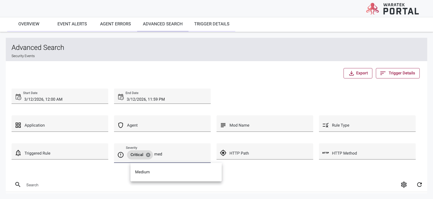 The Trigger Details tab provides an aggregated view of the most common events and triggers that are occurring. Clicking on the Trigger Details tab in the sub-navigation bar will open up the Trigger Details table. The events in this table can be narrowed by keyword in the searchbar and/or by applying the following filters: