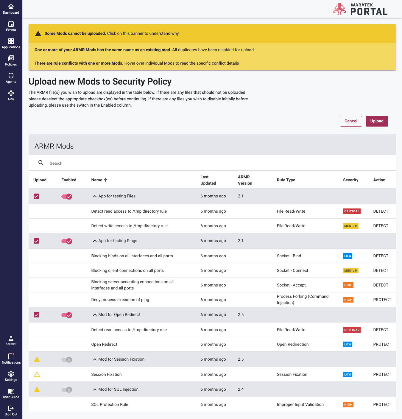 ARMR files can be uploaded within a Policy using the Upload ARMR Mod button at the top of the Policy table. When you drag and drop your files into the upload modal, the screen will update with a list of the Mods and Rules for upload. If there are any Mods for upload that conflicts with existing Mods, you will be notified here with an orange warning banner at the top of the page, and all affected Mods and Rules will be flagged with a warning icon. You can check the Mods you wish to upload and select Save Changes to complete the upload. Any Mods with conflicts are disabled for upload automatically.
