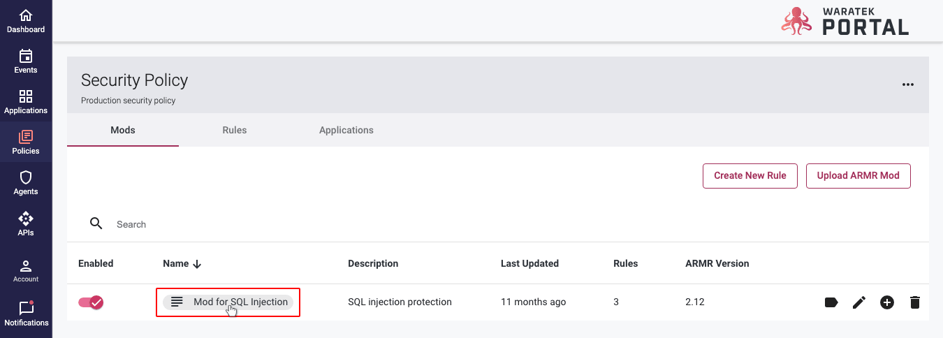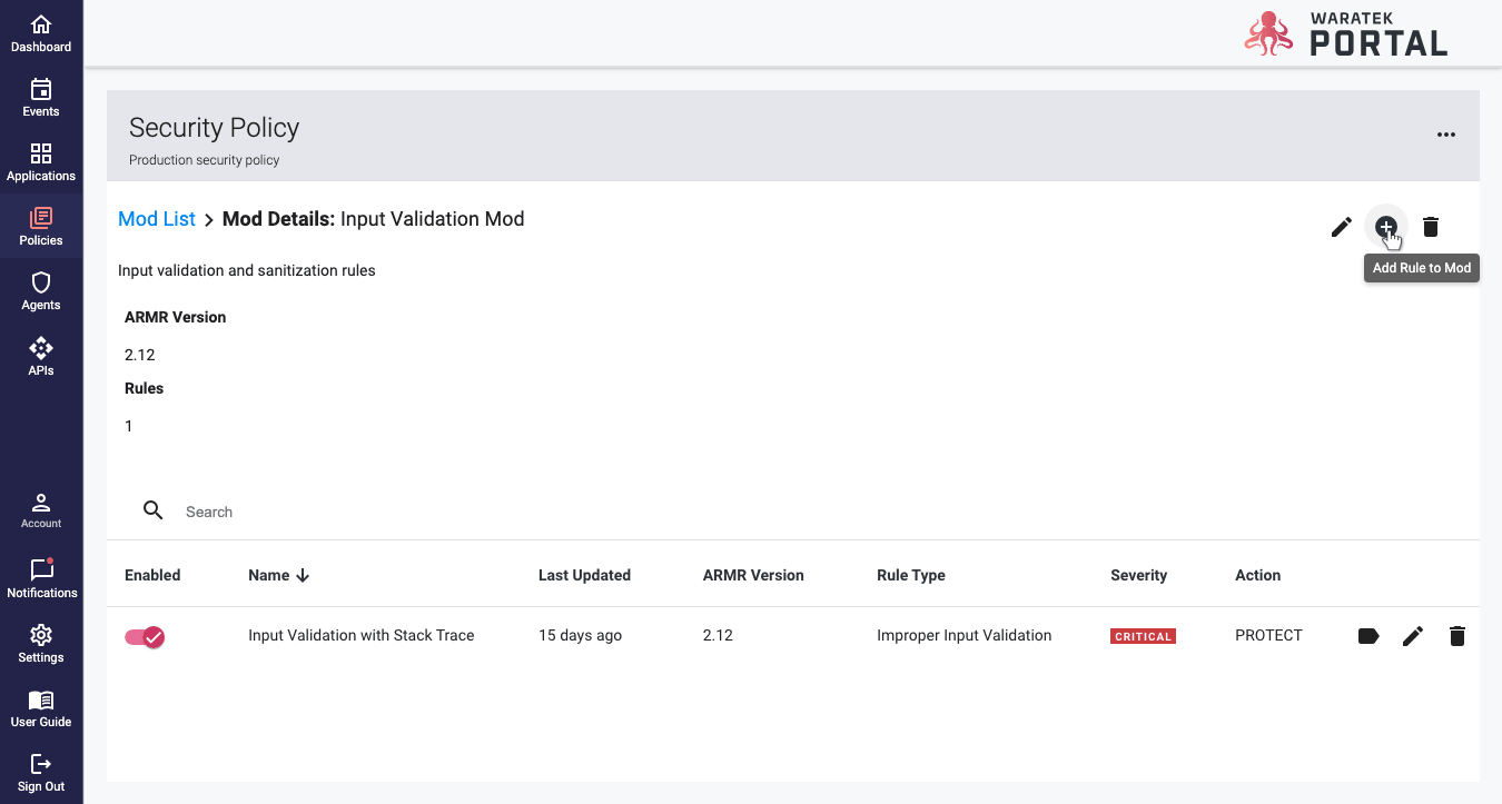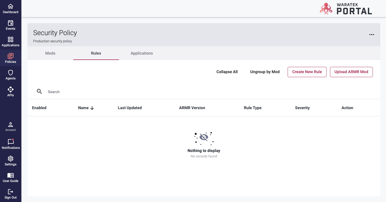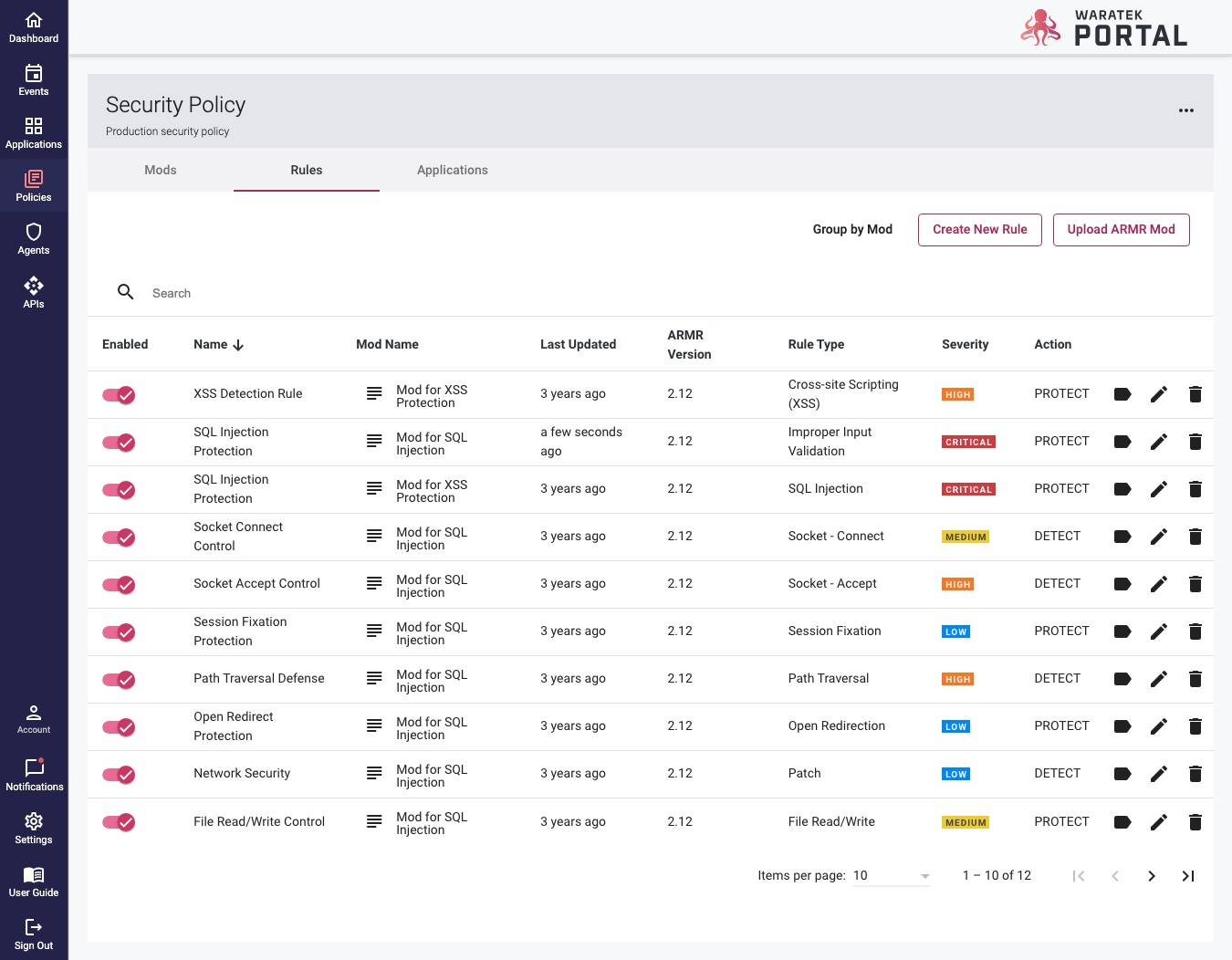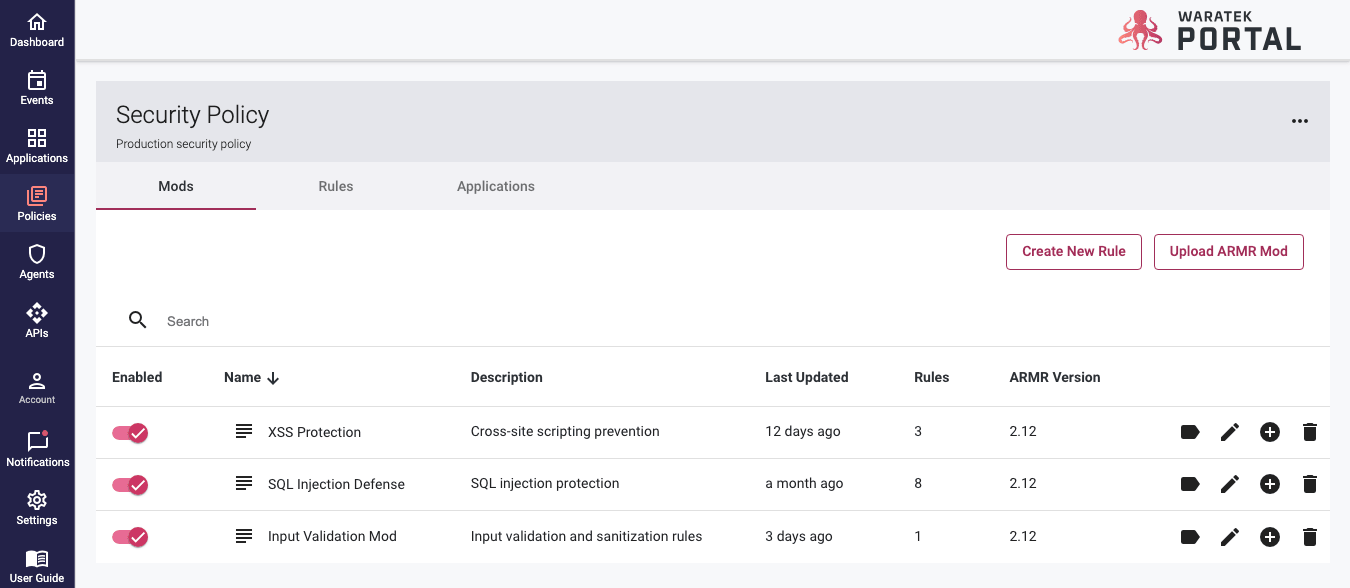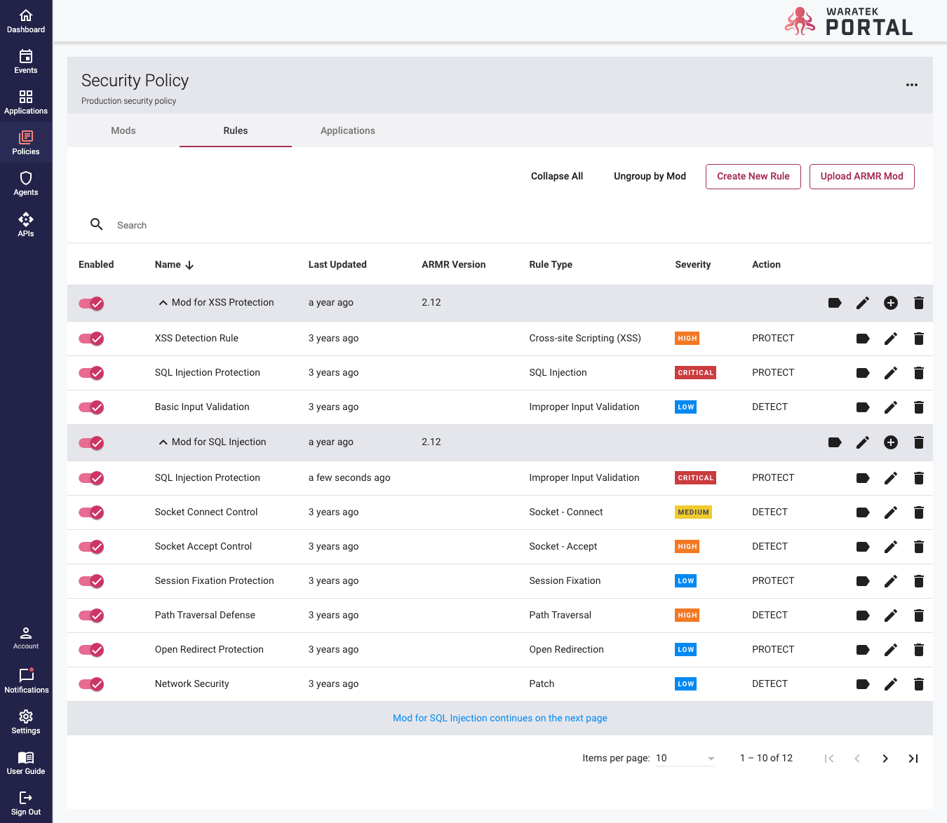 Policies are a collection of Mods and Rules that tell Agents how to behave when certain security events occur. Policies, Mods, and Rules are the basic components that make up the Portal's Policy system. These components are created using Waratek's ARMR language.