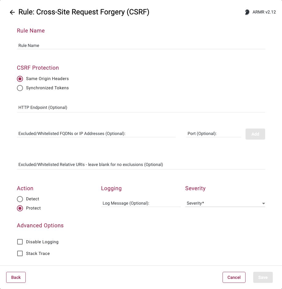 - Token Name - The default token name is _X-CSRF-TOKEN and filled in by default. You may fill in your own value. A blank field will result in an error.