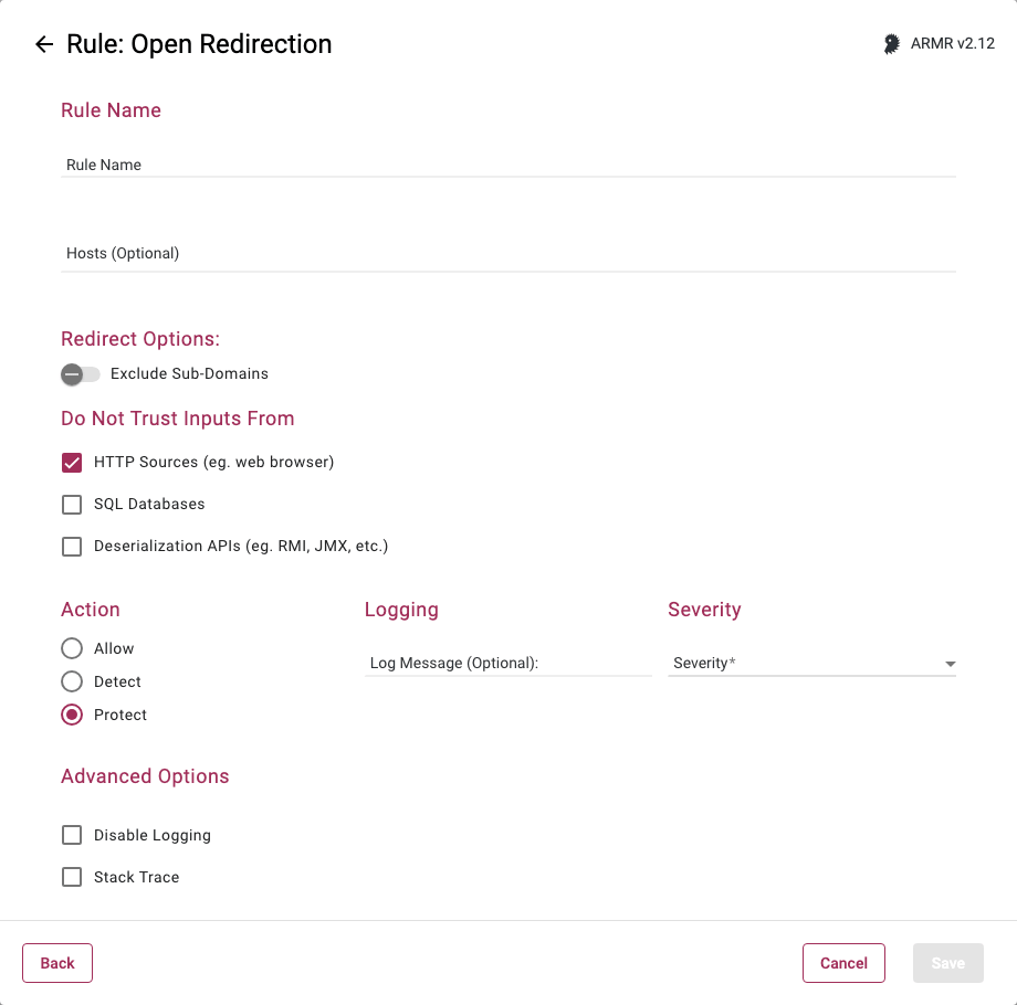 - Protect - In addition to the Detect actions, the Waratek Agent will also stop the redirect.
